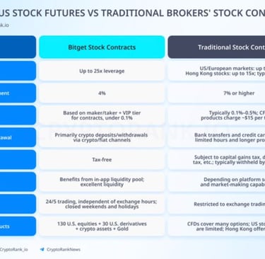 Theo dữ liệu từ CryptoRank.io, Bitget đã nổi bật trong so sánh giữa giao dịch hợp đồng cổ phiếu Mỹ (US Stock Futures) và các hợp đồng cổ phiếu truyền thống, nhờ khả năng mang lại tính linh hoạt, chi phí thấp và hiệu quả vượt trội. Sản phẩm này cho phép người dùng toàn cầu giao dịch cổ phiếu và phái sinh chứng khoán Mỹ trực tiếp trên nền tảng Bitget, thể hiện bước tiến quan trọng trong quá trình hội tụ giữa tài sản số và tài chính truyền thống.