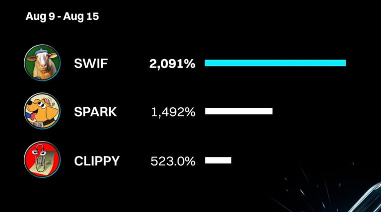 Đứng thứ ba là $CLIPPY, đồng coin đã tăng trưởng hơn 5 lần chỉ trong vòng một tuần. Mặc dù không “cháy” mạnh như $SWIF hay $SPARK, nhưng đây vẫn là một kết quả đáng mơ ước với bất kỳ nhà đầu tư nào.